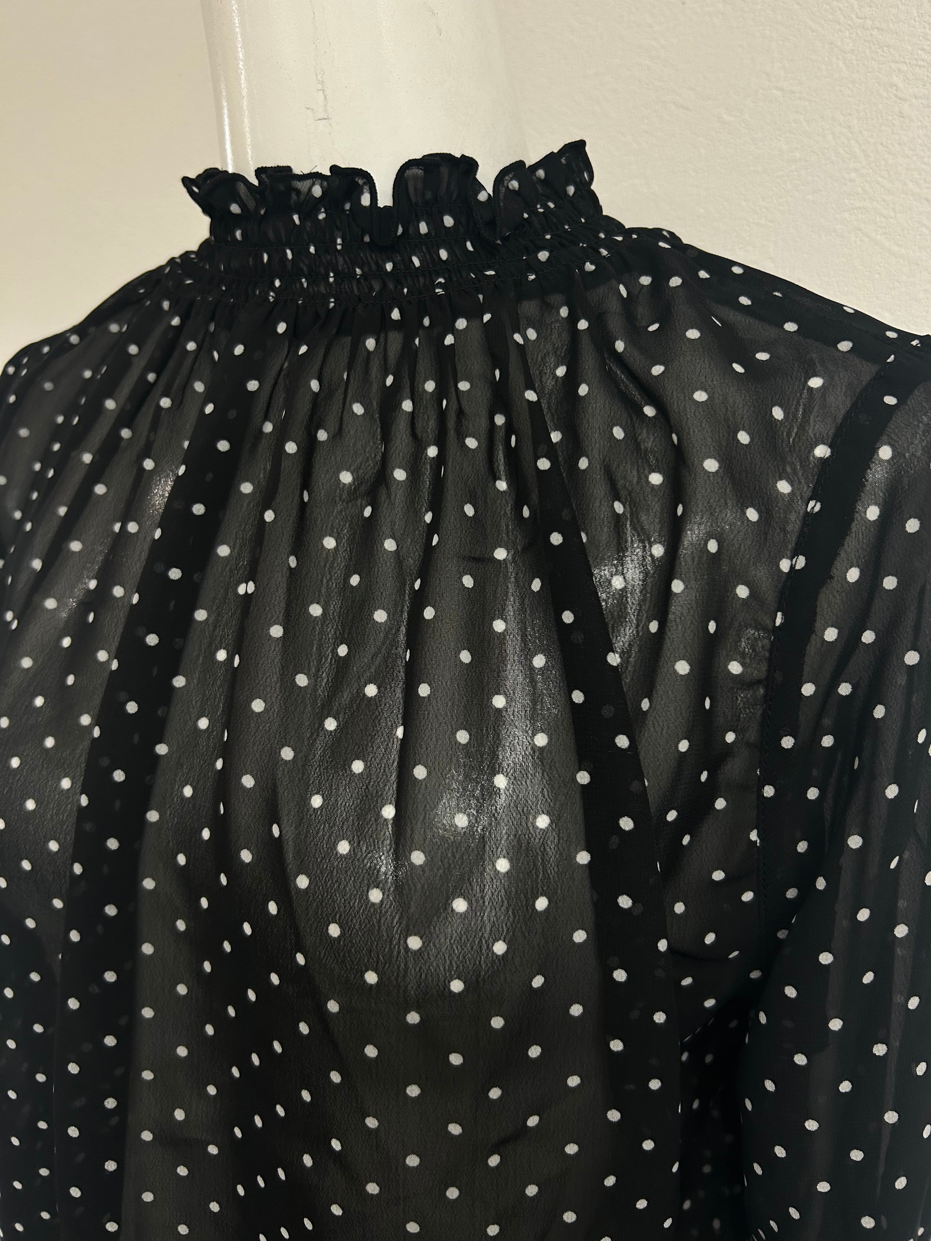 襟と袖のシャーリング仕様で表情のある印象に。ボトムスインもアウトもしやすい丈感で、パンツにもスカートにも合わせやすいアイテムです。
